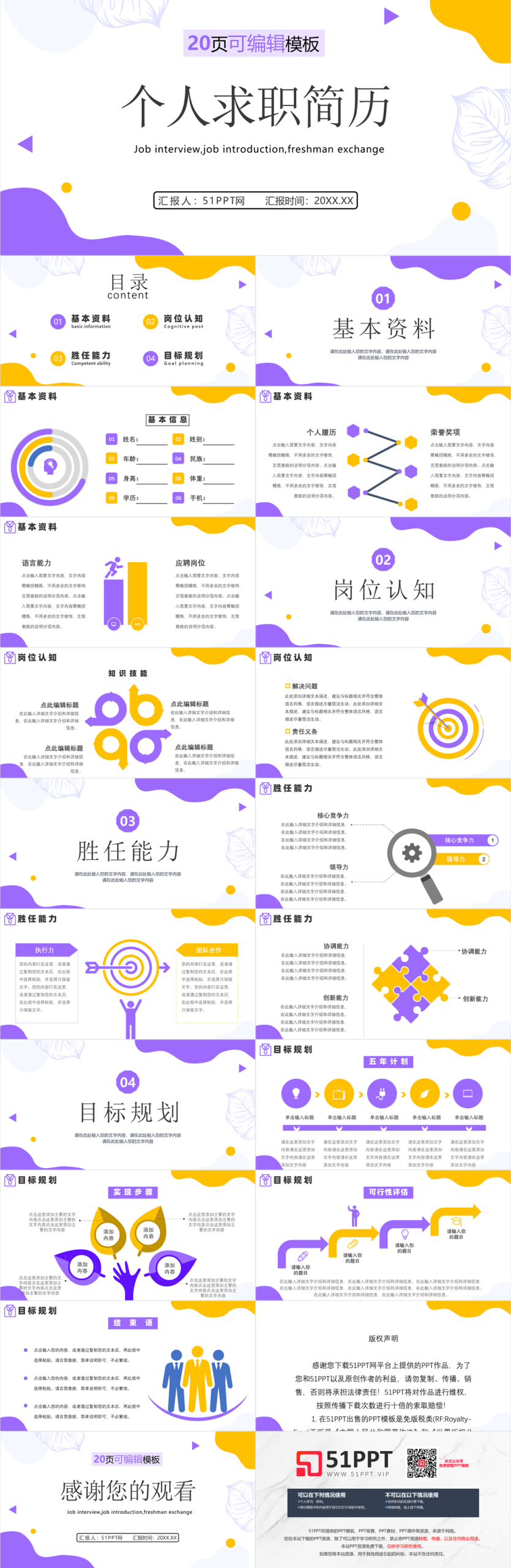本作品内容为 卡通人物个人求职自我简历PPT模板 ,格式为 pptx ,大小 0.26MB ,页数为 20 , 比例为 16 : 9,请使用 软件Power-Point 打开,作品中的文字与图均可以修改和编辑,图片更改请在作品中右键图片并更换,文字修改请直接点击文字进行修改,也可以新增和删除作品中的内容。