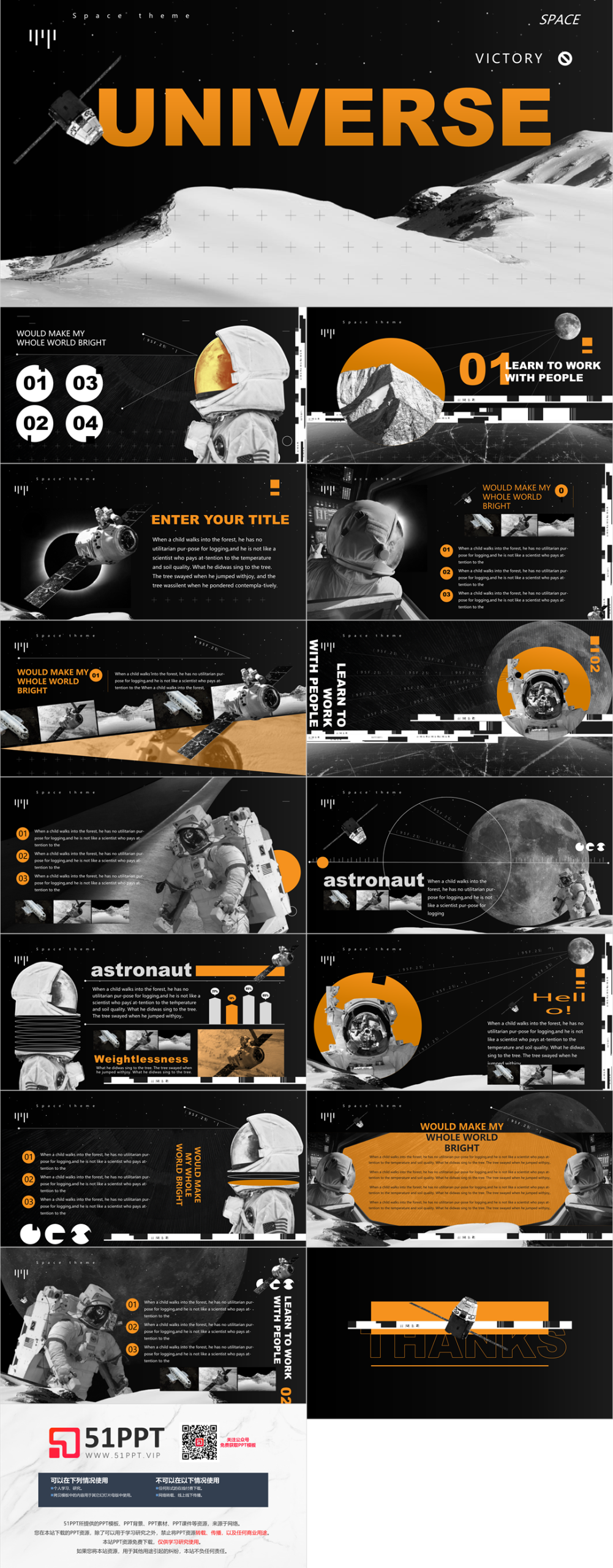 PowerPoint模板内容页,由13张黑色动态幻灯片图表,搭配PPT文字排版组成。另外使用了卫星插图、宇航员插图等装饰。