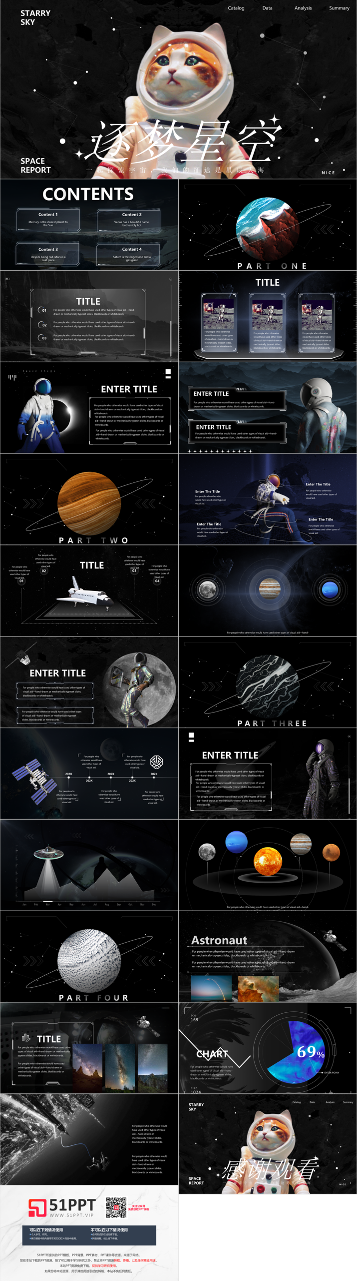 这是一套黑色卡通小猫背景的“逐梦星空”欧美商务汇报PPT模板,共21页;