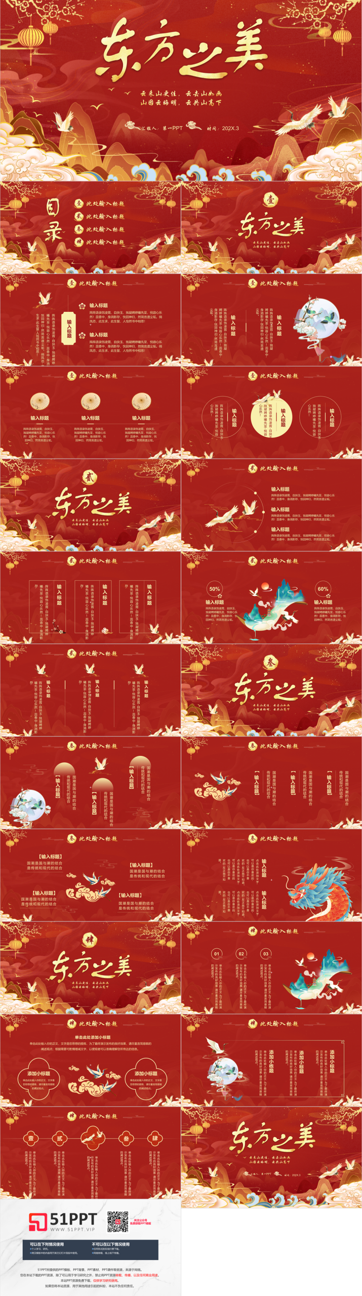 这是一套红色国潮群山仙鹤背景“东方之美”中国风通用PPT模板,共21页;