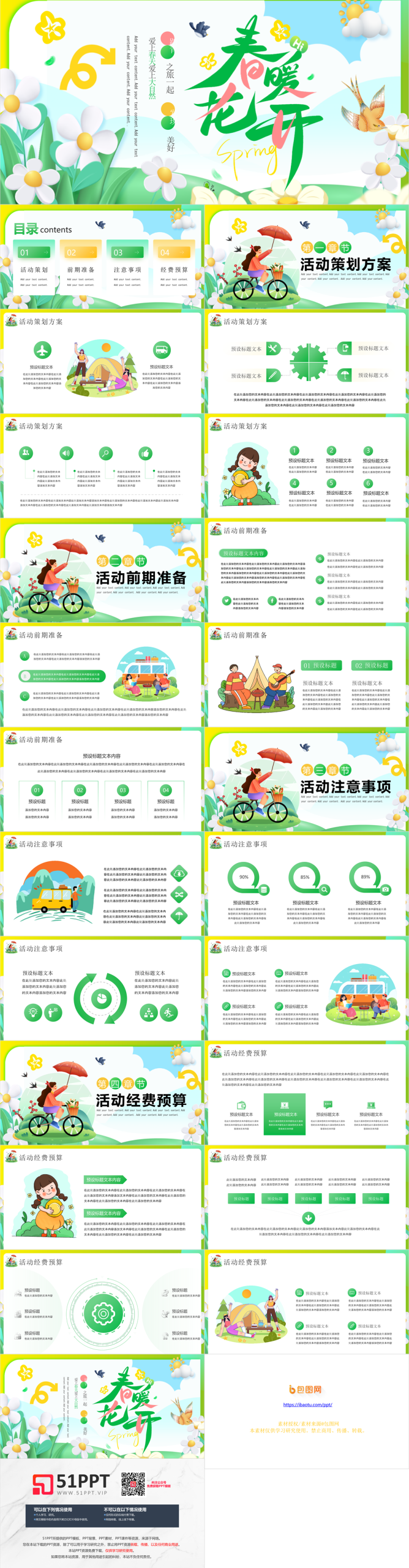 这是一套绿色清新卡通花卉小鸟背景的“春暖花开”春日主题商务汇报PPT模板,共22页;
