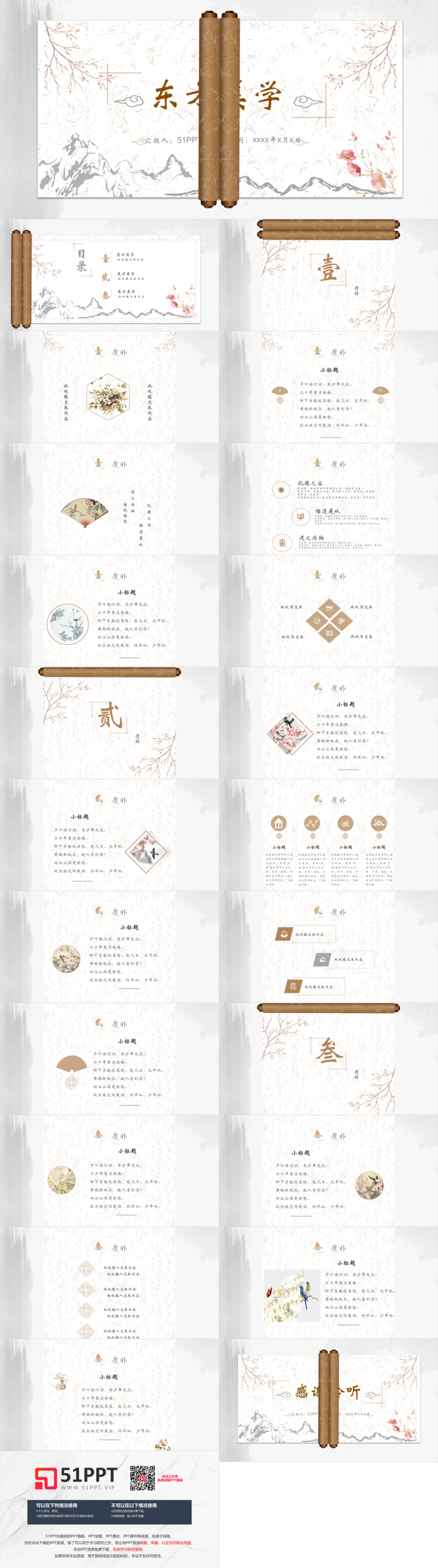 这是一套古典画卷背景的“东方美学”中国风通用PPT模板,共21页;